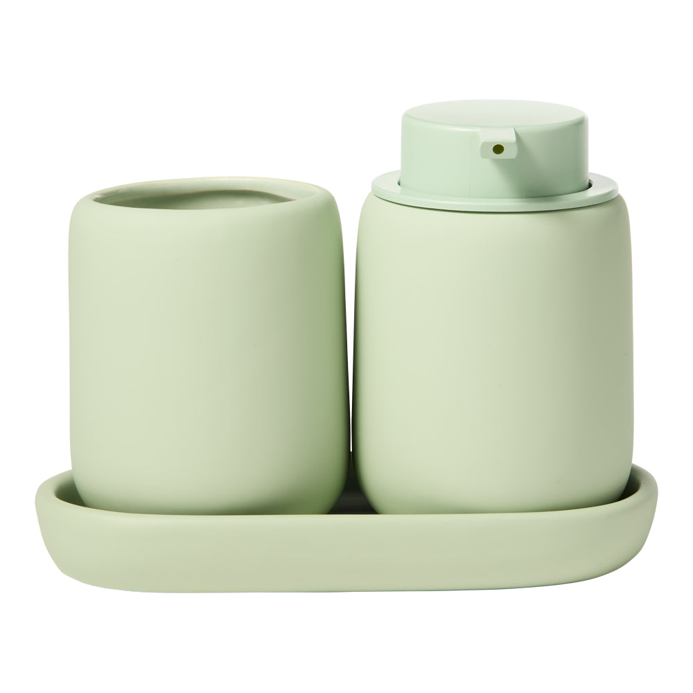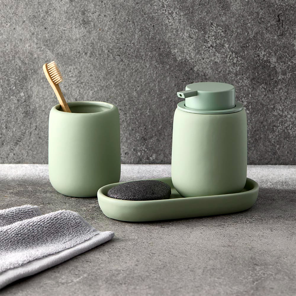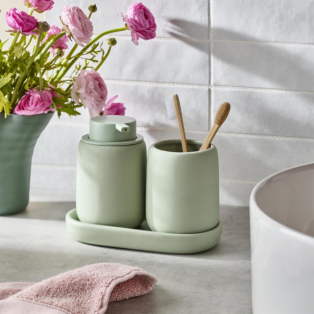 Elevate your bathroom aesthetic with the Adorn Living® Alma Bathroom Set of 3. This elegant bathroom accessory set includes a sleek soap dispenser, tumbler, and tray, all crafted from smooth, matte finish ceramic. Available in 2 on-trend colours, Moss and Clay, the Alma Bathroom Set adds a touch of contemporary style to any space. Designed to complement the Adorn Living® Toggle Bath Mat, Runner, and Contour Bath Mat, this set seamlessly integrates into your decor for a cohesive look. The Alma Bathroom Set enhances your experience while offering practicality and style. Shop Adorn Living® for more bathroom accessories perfect for every home.