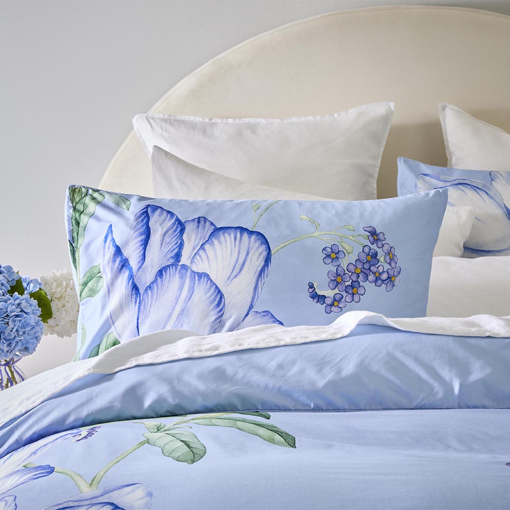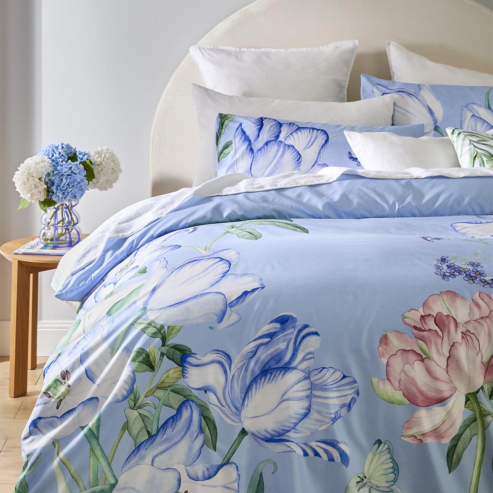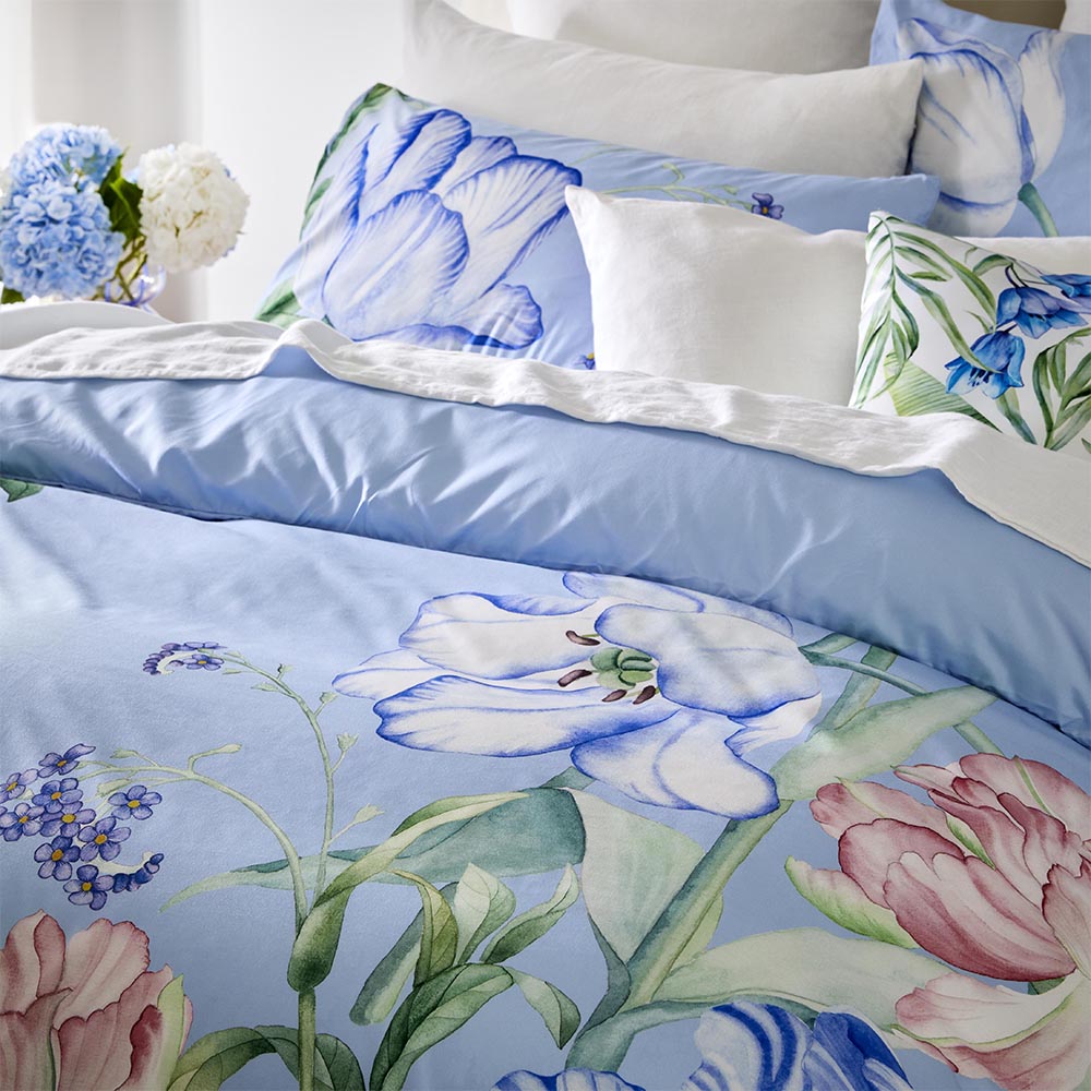 • Soft blue quilt cover featuring elegant tulips, peonies, and delicate forget-me-nots with green foliage and charming butterfly accents for a sophisticated botanical look