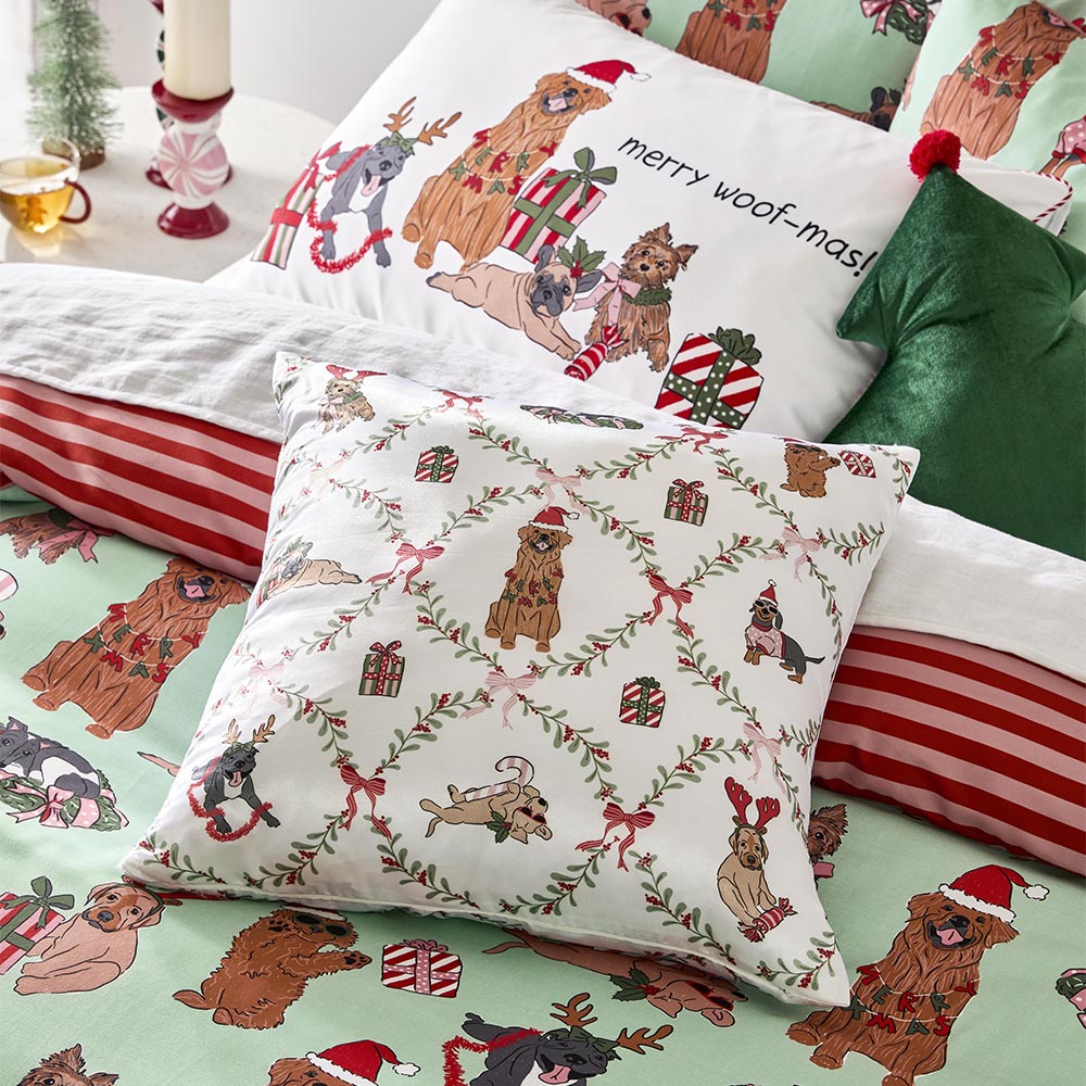 The Adorn Living® Xmas Dogs Cushion features adorable festive pups in Santa hats, reindeer antlers, and Christmas scarves arranged within charming holly wreaths on a crisp white background. Crafted from premium materials for lasting softness and durability, this delightful cushion brings holiday cheer to any room and makes a paw-fect Christmas decoration for dog lovers! Par with the matching quilt cover set for a complete, festive look. Shop Adorn Living® for more bed linen including quilt covers, bed sheets, pillowcases, throws, and blankets