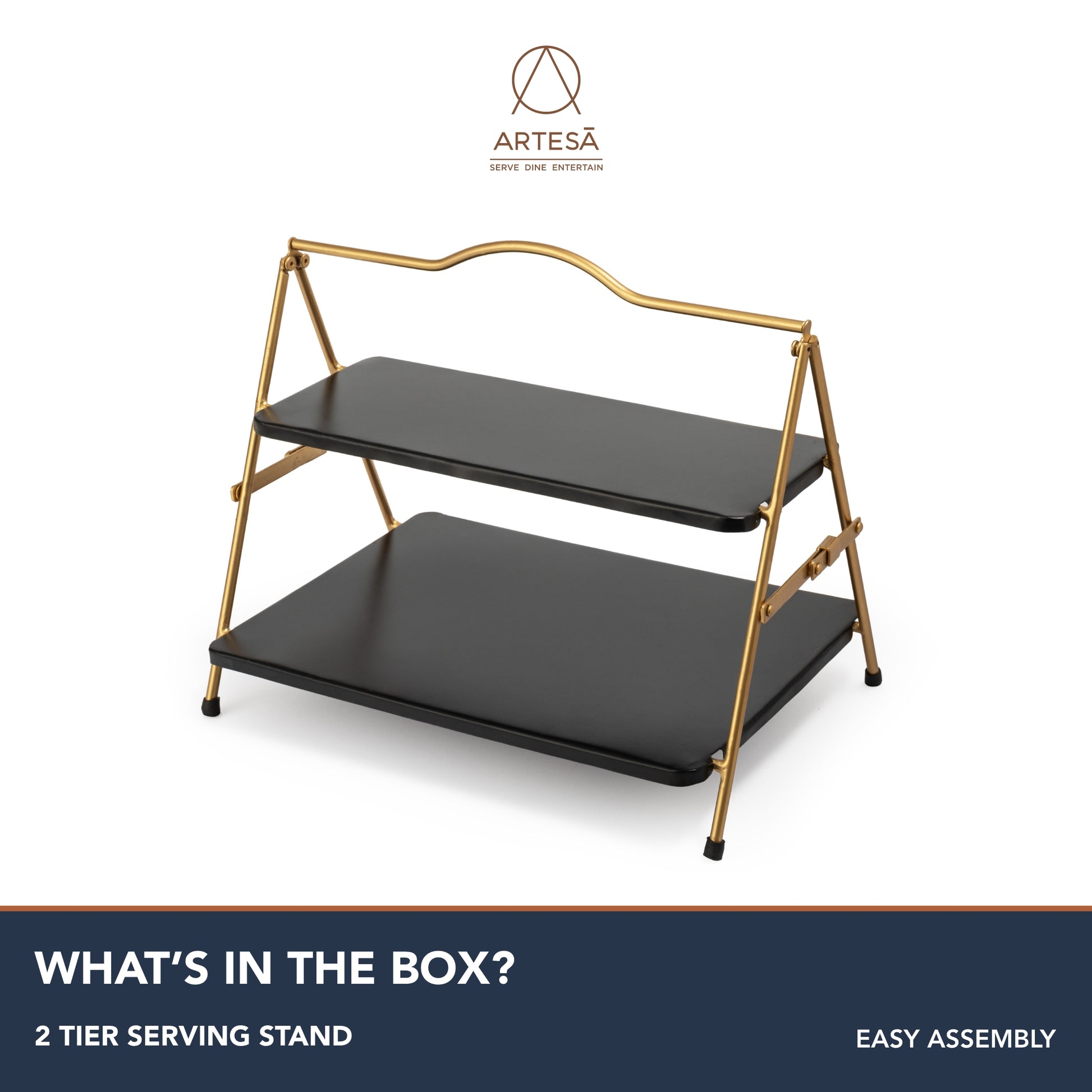 • MADE TO LAST: With hard wearing black metal shelves and a sleek gold metal frame this 2 tier serving stand can be used time after time to display your food of choice