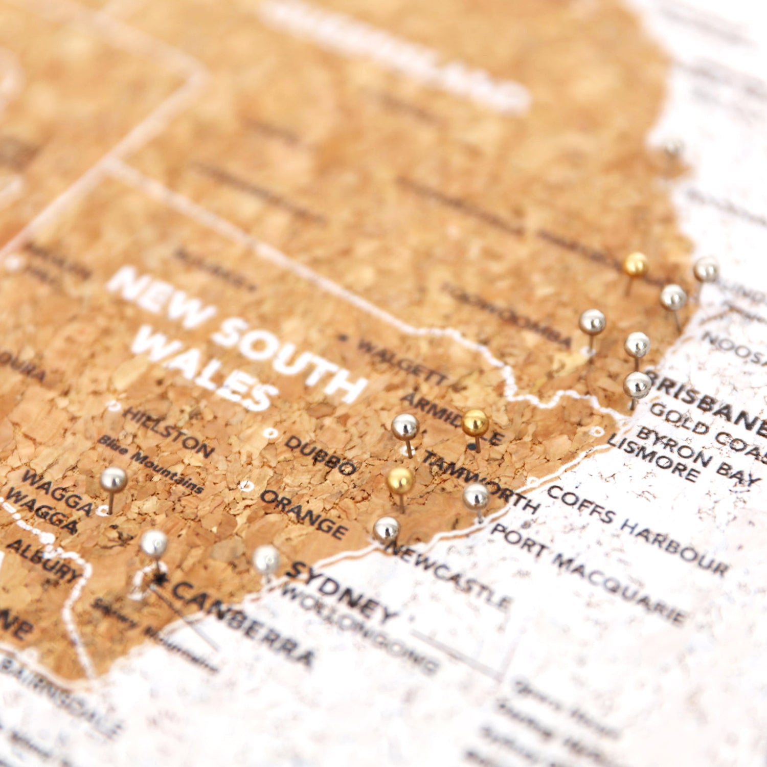 The cult-favourite Travel Board collection is a framed cork board range in a variation of sizes of the World, Europe, New Zealand, or Australia. Each map comes with a point-of-sale wrap including a set of colour-coded, metallic marker pins; to keep a record of where you have travelled to, and mark the places on your wish list!.