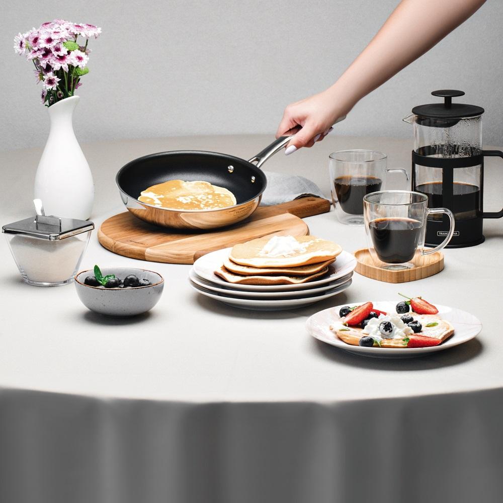 You will see the difference in the kitchen with Tramontina's 20cm 1.2L shallow stainless steel frying pan with long handle, tri-ply body and interior non-stick Starflon Premium coating from the Grano line. Perfect for making a variety of dishes, it is made with tri-ply body technology (stainless steel + aluminium + stainless steel), which speeds up the cooking process. Its interior non-stick coating and elegant high-gloss finish make it the perfect choice to be displayed and served at the table. Easier cleaning and with rounded corners, it can go in the dishwasher on a daily basis. It has a 20cm diameter, an ideal size for your kitchen demands. This frying pan can be used on gas, electric, glass ceramic and induction cooktops.